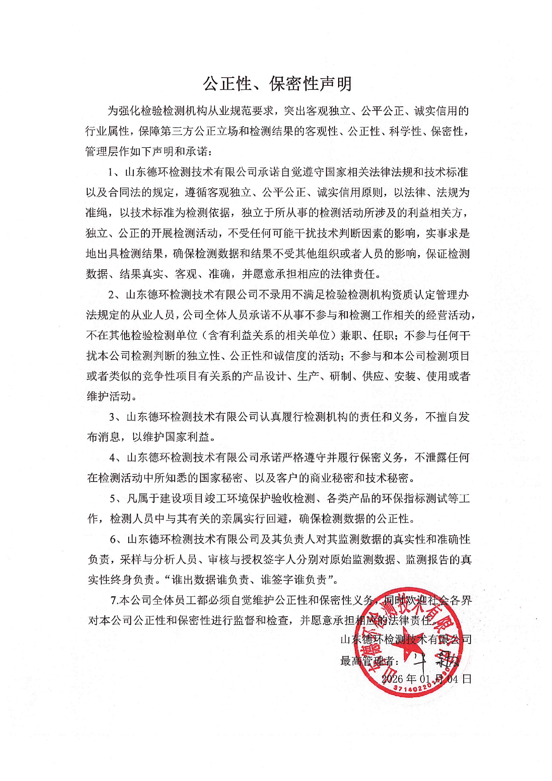 為強(qiáng)化檢驗檢測機(jī)構(gòu)從業(yè)規(guī)范要求,突出客觀獨立、公平公正、誠實信用的行業(yè)屬性,保障第三方公正立場和檢測結(jié)果的客觀性、公正性、科學(xué)性、保密性,管理層作如下聲明和承諾: 1、山東德環(huán)檢測技術(shù)有限公司承諾自覺遵守國家相關(guān)法律法規(guī)和技術(shù)標(biāo)準(zhǔn)以及合同法的規(guī)定,遵循客觀獨立、公平公正、誠實信用原則,以法律、法規(guī)為準(zhǔn)繩,以技術(shù)標(biāo)準(zhǔn)為檢測依據(jù),獨立于所從事的檢測活動所涉及的利益相關(guān)方,獨立、公正的開展檢測活動,不受任何可能干擾技術(shù)判斷因素的影響,實事求是地出具檢測結(jié)果,確保檢測數(shù)據(jù)和結(jié)果不受其他組織或者人員的影響,保證檢測數(shù)據(jù)、結(jié)果真實、客觀、準(zhǔn)確,并愿意承擔(dān)相應(yīng)的法律責(zé)任。 2、山東德環(huán)檢測技術(shù)有限公司不錄用不滿足檢驗檢測機(jī)構(gòu)資質(zhì)認(rèn)定管理辦法規(guī)定的從業(yè)人員,公司全體人員承諾不從事不參與和檢測工作相關(guān)的經(jīng)營活動,不在其他檢驗檢測單位(含有利益關(guān)系的相關(guān)單位)兼職、任職;不參與任何干擾本公司檢測判斷的獨立性、公正性和誠信度的活動;不參與和本公司檢測項目或者類似的競爭性項目有關(guān)系的產(chǎn)品設(shè)計、生產(chǎn)、研制、供應(yīng)、安裝、使用或者維護(hù)活動。 3、山東德環(huán)檢測技術(shù)有限公司認(rèn)真履行檢測機(jī)構(gòu)的責(zé)任和義務(wù),不擅自發(fā)布消息,以維護(hù)國家利益。 4、山東德環(huán)檢測技術(shù)有限公司承諾嚴(yán)格遵守并履行保密義務(wù),不泄露任何在檢測活動中所知悉的國家秘密、以及客戶的商業(yè)秘密和技術(shù)秘密。 5、凡屬于建設(shè)項目竣工環(huán)境保護(hù)驗收檢測、各類產(chǎn)品的環(huán)保指標(biāo)測試等工作,檢測人員中與其有關(guān)的親屬實行回避,確保檢測數(shù)據(jù)的公正性。 6、山東德環(huán)檢測技術(shù)有限公司及其負(fù)責(zé)人對其監(jiān)測數(shù)據(jù)的真實性和準(zhǔn)確性負(fù)責(zé),采樣與分析人員、審核與授權(quán)簽字人分別對原始監(jiān)測數(shù)據(jù)、監(jiān)測報告的真實性終身負(fù)責(zé)?!罢l出數(shù)據(jù)誰負(fù)責(zé)、誰簽字誰負(fù)責(zé)”。 7.本公司全體員工都必須自覺維護(hù)公正性和保密性義務(wù),同時歡迎社會各界對本公司公正性和保密性進(jìn)行監(jiān)督和檢查,并愿意承擔(dān)相應(yīng)的法律責(zé)任。 山東德環(huán)檢測技術(shù)有限公司 2026年01月04日 微信圖片_20260104090332.jpg